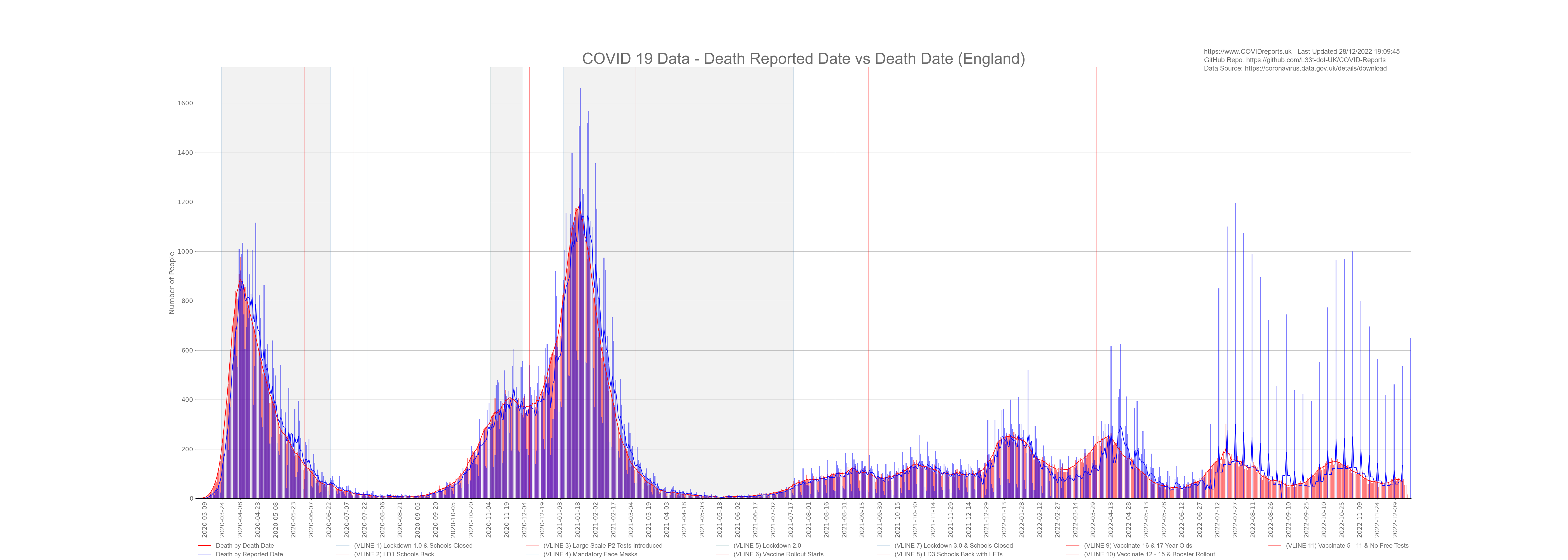 If you were to zoom in on the graph you will notice that during most weeks the blue bars (death by reported date) will be higher than the red bars (death by death date) for 5 days and then lower for 2 days. These 2 days will be the weekend. At the start of COVID this was Saturday and Sunday however a change was made at some point and the lower days ended up being Sunday and Monday.