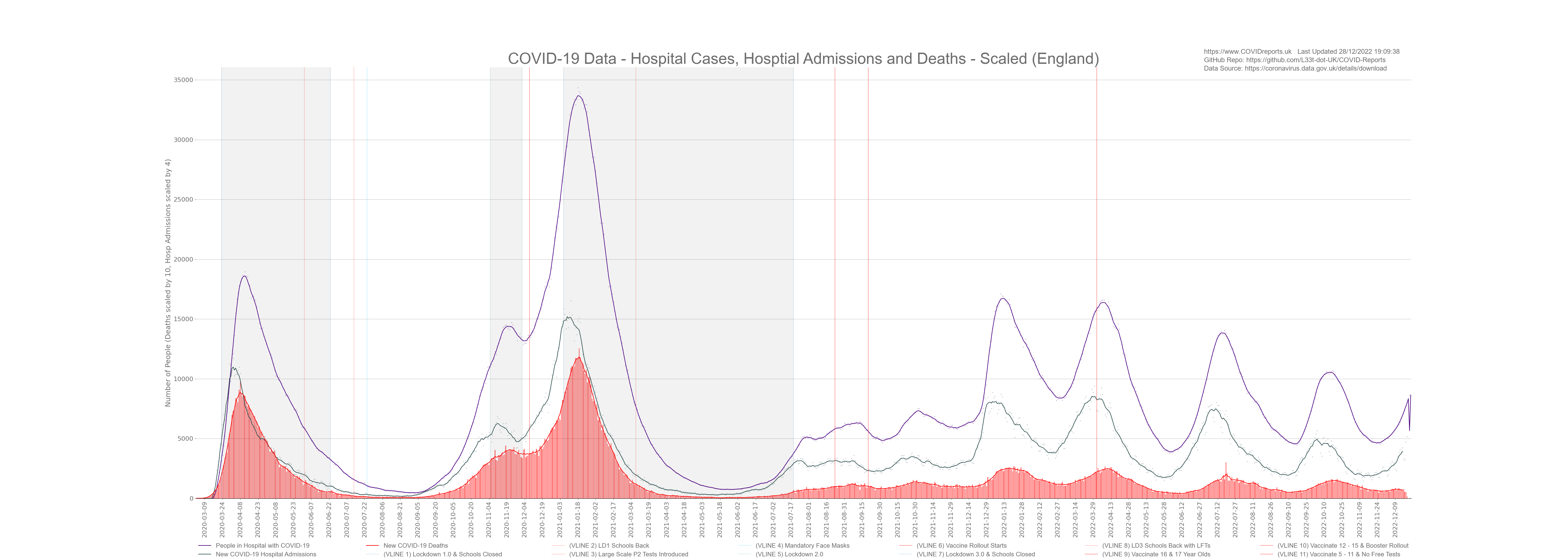 Lets start by looking at an overview of COVID where we can look at cases, hospital admissions, people in hospital and deaths. All time series graphs on this website will have certain events on the x-axis, these events are shown in the legend of the below graph and mark lockdowns, introduction of face masks, start of vaccination, etc. For these events I use the same colour lines to keep the graphs consistent. These Lines are denoted as (VLINE) in the legend.
